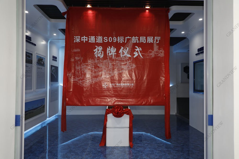 2020年的第一天,廣航局展廳成功舉行了揭牌儀式,此展廳是廣角繼圓滿完成深中通道沉管預制廠智能展廳建設后的又一力作。