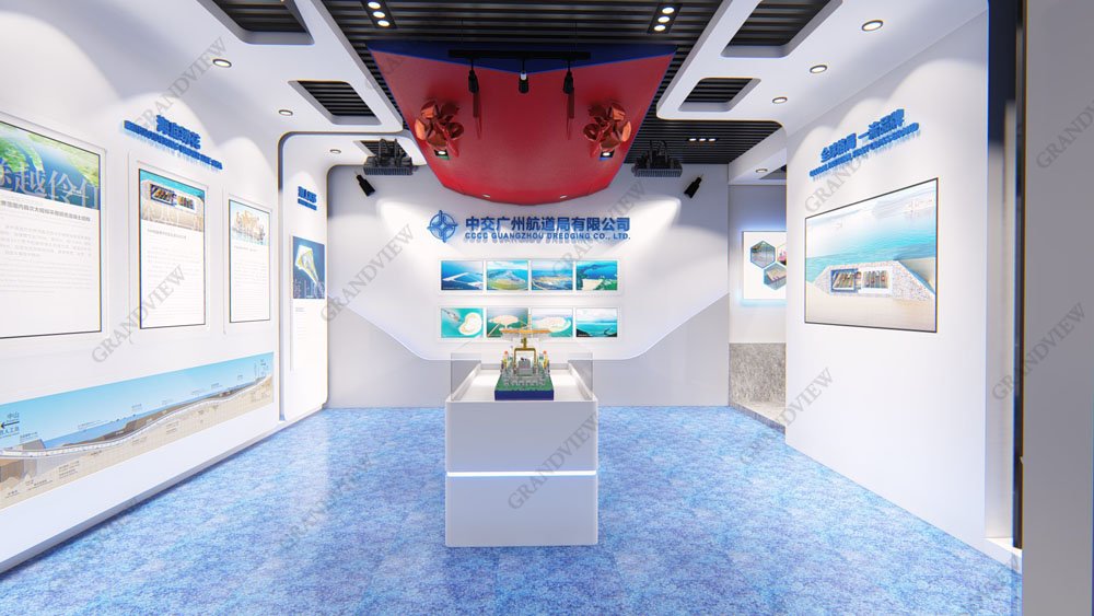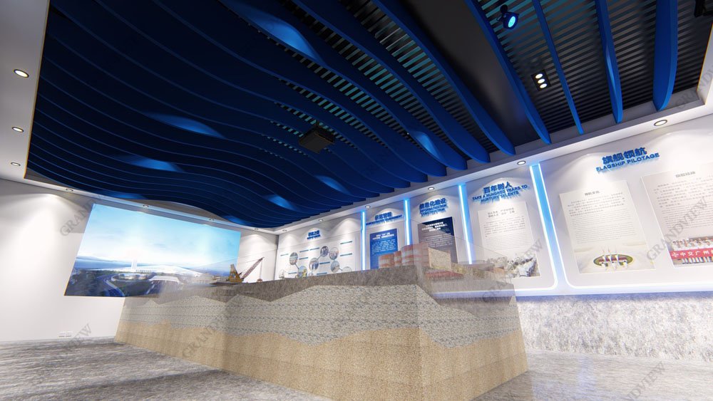 根據廣航局在深中通道建設中負責的海底基槽清淤的施工內容,及廣航局的海上業務特點,廣航局展廳在設計時采用了大量的海洋元素。展廳圓弧形的設計來自船舶頭尾的弧形,線條優美簡約,展廳的地板由藍色和黃褐色的地基展示,吊頂則以藍色的波紋展現,海面海下場景一應俱全,讓人仿佛置身于大海之中,與廣航局的業務范疇,企業理念相契合。