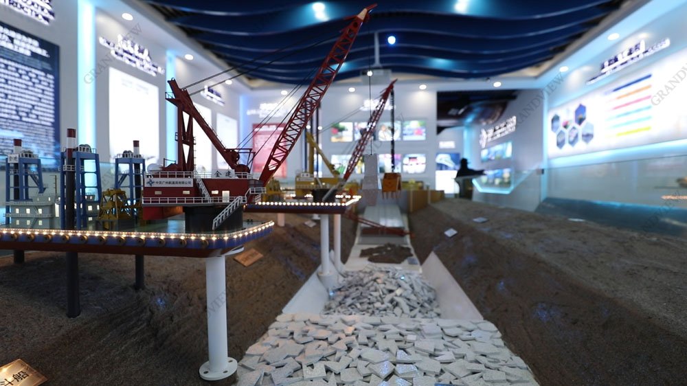 6.7×1.7米的沙盤模型展示的是基槽清淤的施工流程,制作精良,邊坡比經過了嚴密的計算,模型的仿真度和還原度極高,力求為大家呈現出一個完美的視覺空間。模型旁邊墻上的施工流程圖依次對照模型里面的船舶進行施工流程解說。船舶呈動態模式,可模擬施工動作,技術先進,業內少見。