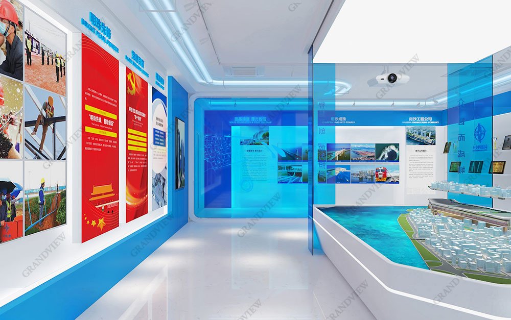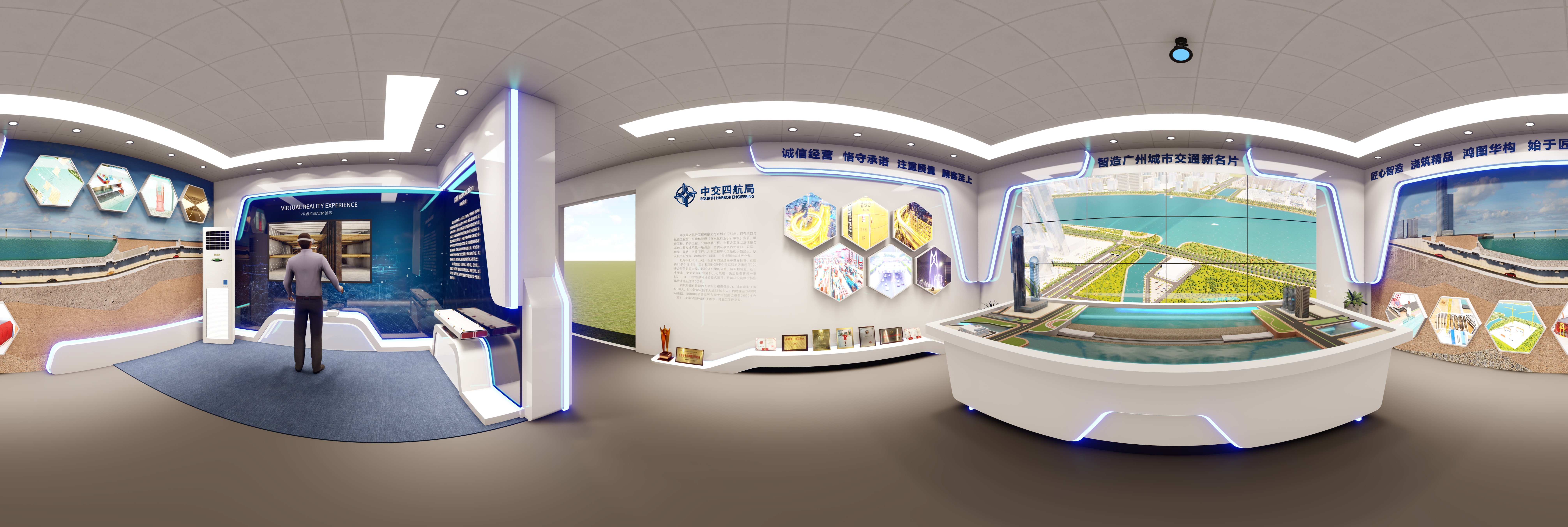 南沙橫瀝展廳與黨建室設計中,憑借與中交四航局長期的合作經驗,熟諳四航局的雄厚項目經驗與資歷,將人才實力及設備實力、項目成果與獎項等內容,以創新智能升降沙盤、智融物聯燈光控制、沙盤燈光與視頻結合展示等新科技技術加以展示。