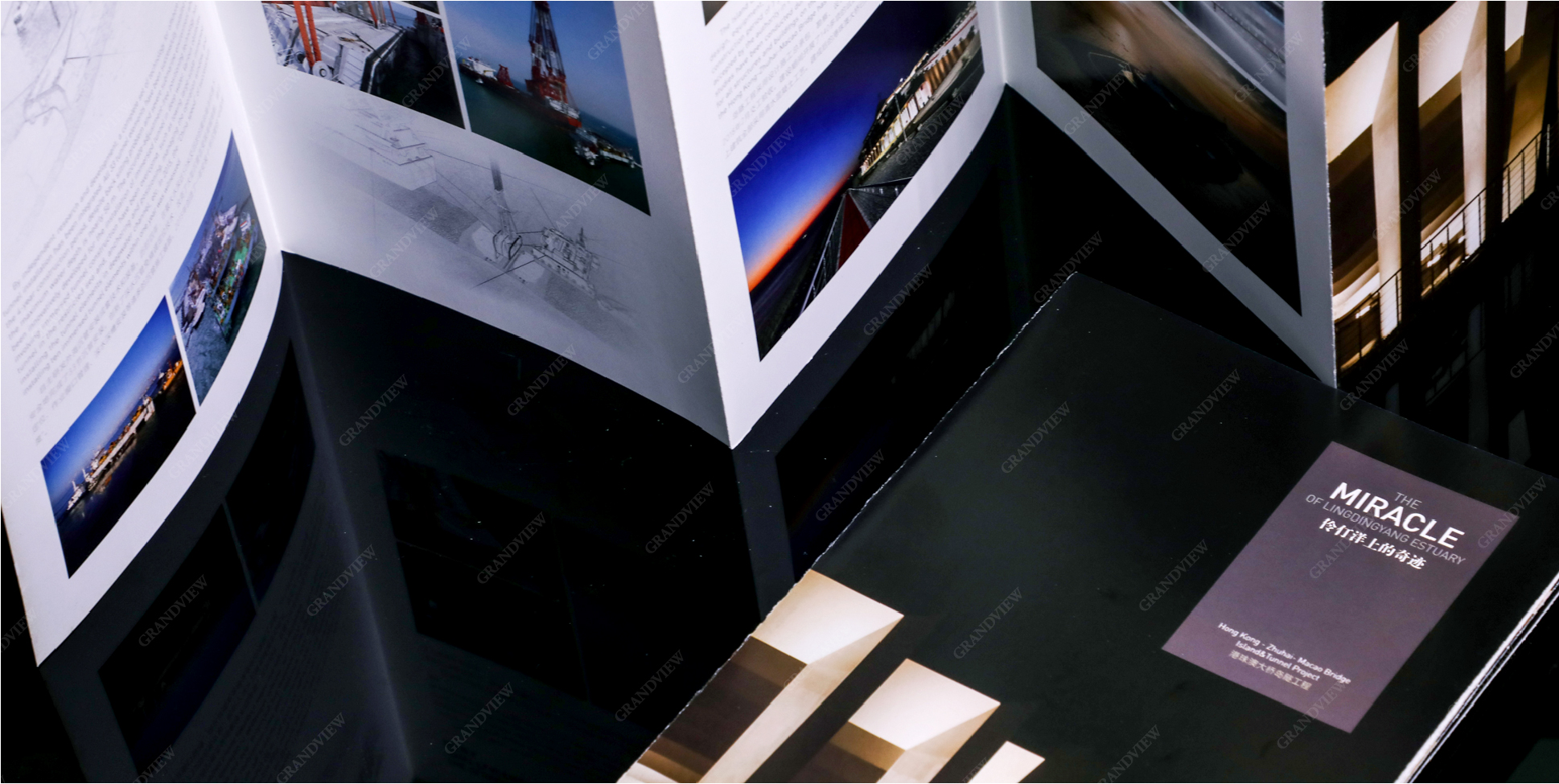 畫冊圖片以藍色為主色調,與主題《伶仃洋上的奇跡》遙相呼應;多采用大跨頁精美圖片,形成強烈的視覺沖擊;板塊清晰、結構完整、既能全方位概括,又有重點突出,將島隧工程完美展現。