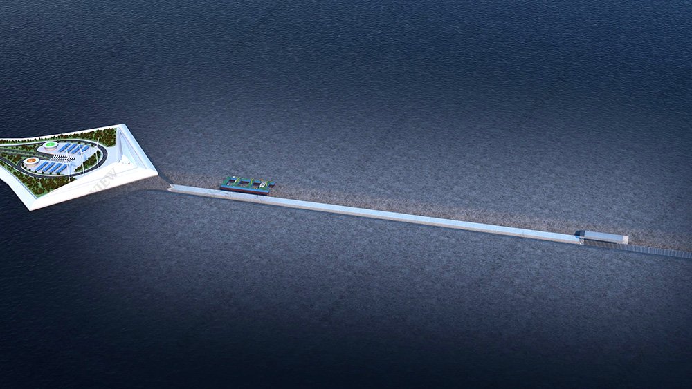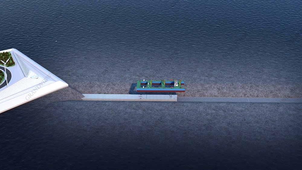 在畫面的呈現上,我們采用圖層透明羽化疊加手法:通過分別渲染正常海面以及只有海床的效果,通過后期處理,透明疊加的方式,柔和過渡沉管工程在水下的形態。